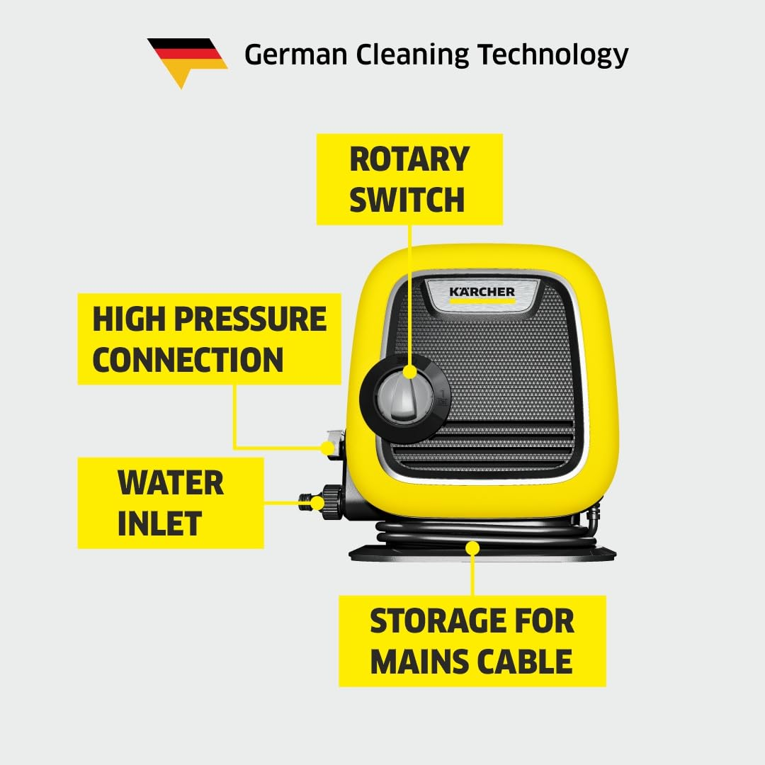 The Kärcher K Mini is the smallest and most compact pressure washer in the Kärcher lineup, designed for quick and efficient cleaning of small outdoor areas, bicycles, patio furniture, and compact cars. With its ultra-lightweight design, 5-metre PremiumFlex hose, Quick Connect system, and integrated storage solutions, it brings convenience and performance together in an easy-to-handle, space-saving package.
