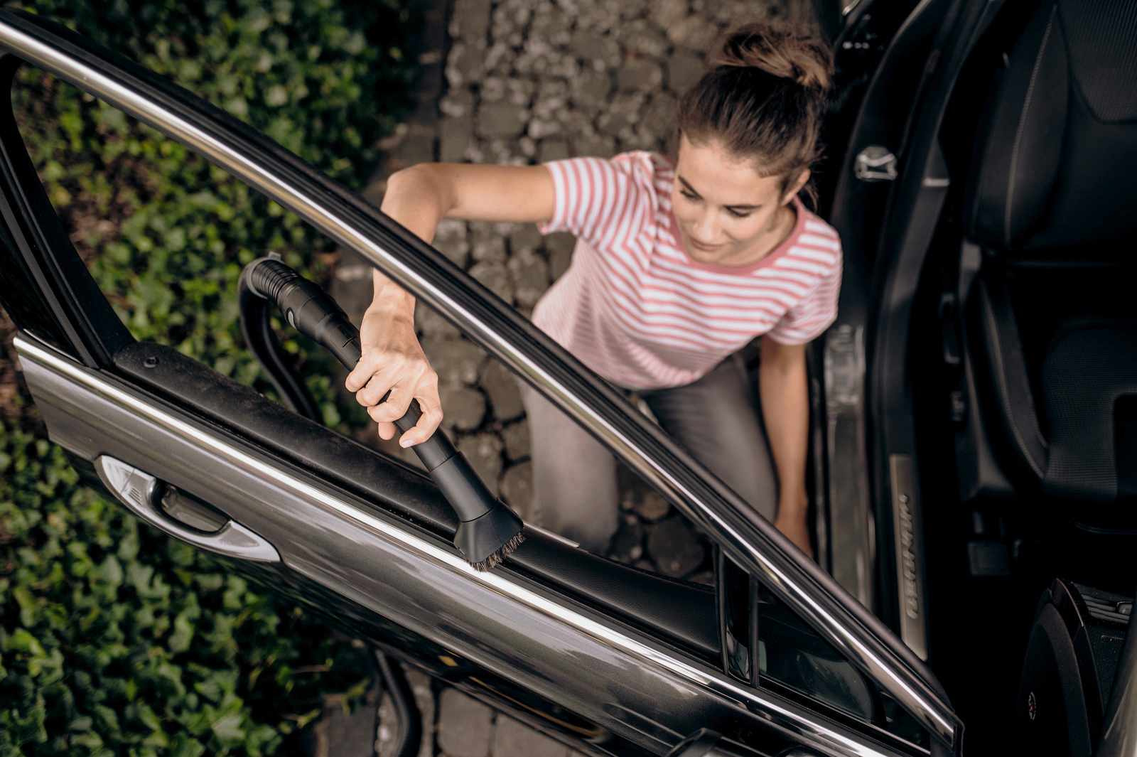 his accessory kit includes two suction brushes for Kärcher wet & dry vacuums, ideal for detailed interior cleaning of vehicles and soft surfaces. One brush has hard bristles for deep cleaning carpets, car seats, and floor mats, while the other has soft bristles for gentle treatment of dashboards, upholstery, and delicate surfaces. Designed to work with Kärcher Home & Garden WD-series vacuum cleaners, it helps maintain cleanliness without damaging sensitive materials.