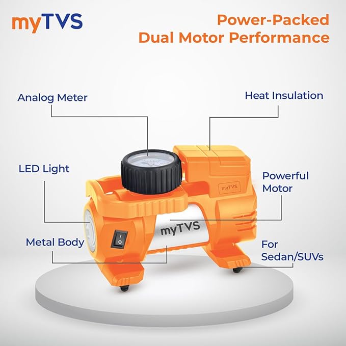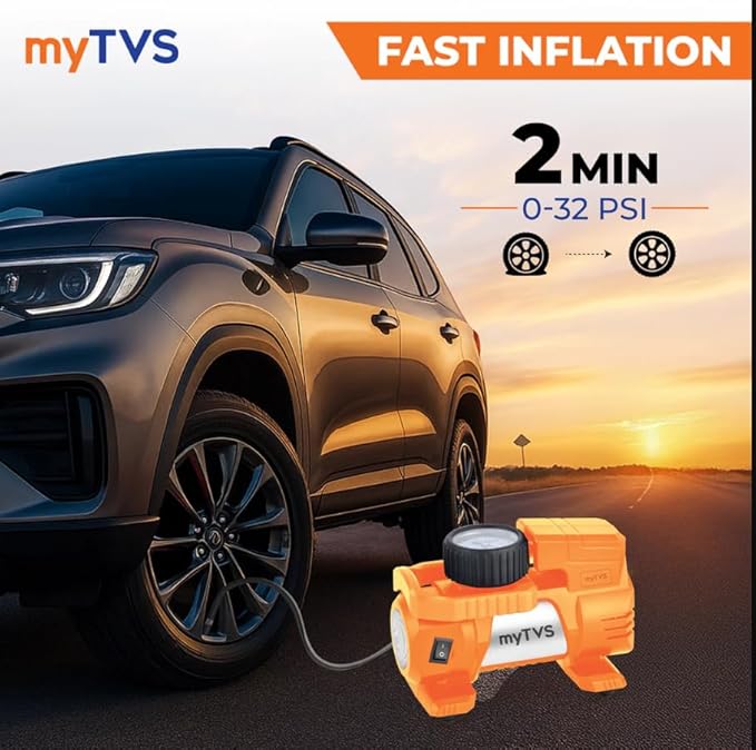 myTVS TI-9 Compact Metal Tyre Inflator – 150 PSI Power with Analog Gauge, LED Light & Heat-Insulation Body | Suitable for Car & Bike | 1+1 Year Warranty.