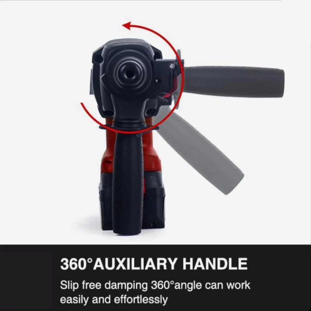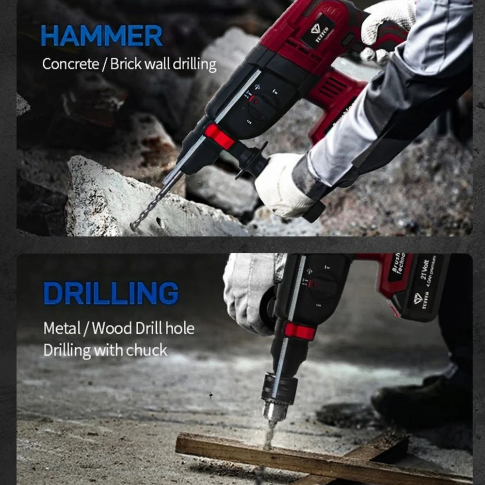 The Tuffco TC-20 is a heavy-duty cordless rotary hammer drill designed for professional and industrial use. Equipped with a brushless motor and powered by two 24 V, 5 Ah lithium-ion batteries, it offers long-lasting performance and high efficiency. Featuring three selectable modes—rotation + hammering for concrete drilling, rotation only for wood/steel, and hammer only for chiseling—it delivers a no-load speed of 960 RPM, impact frequency of up to 4,260 impacts per minute, and impressive drilling capacities: 26 mm in concrete, 13 mm in steel, and 30 mm in wood. The kit includes bits, chisels, LED light, and a 360° auxiliary handle—making it a versatile tool for heavy-duty demolition, drilling, and chiseling tasks.